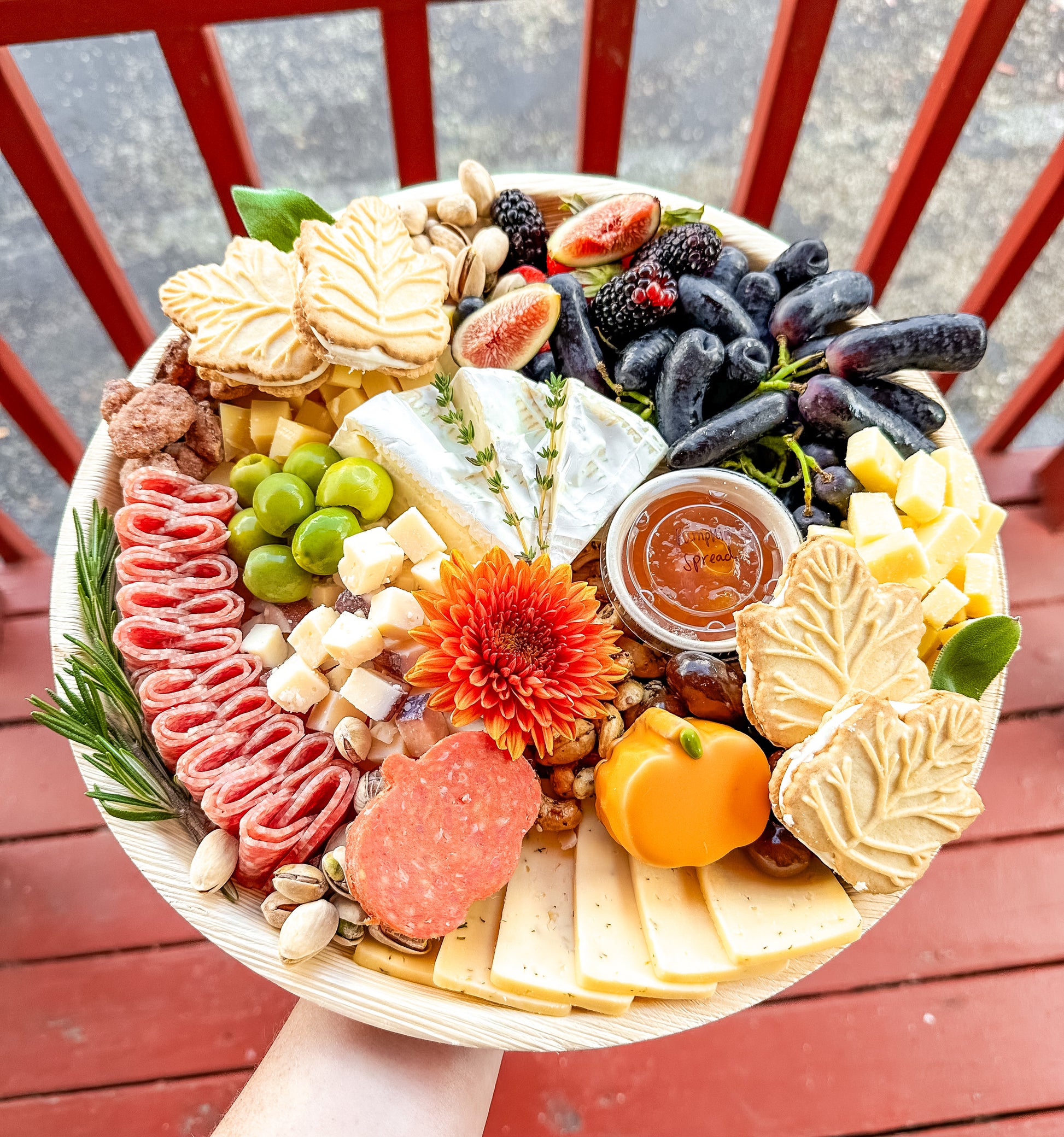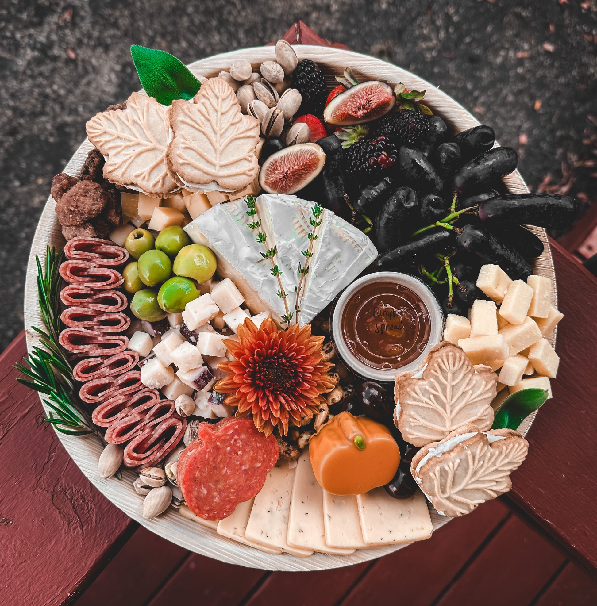 On our 12" round disposable palm leaf tray, we fill this tray up with fall favorites. Each tray is unique in style & ingredient selections but all consist of seasonal cheeses, meats, accompaniments & dips. This tray serves 4-6.