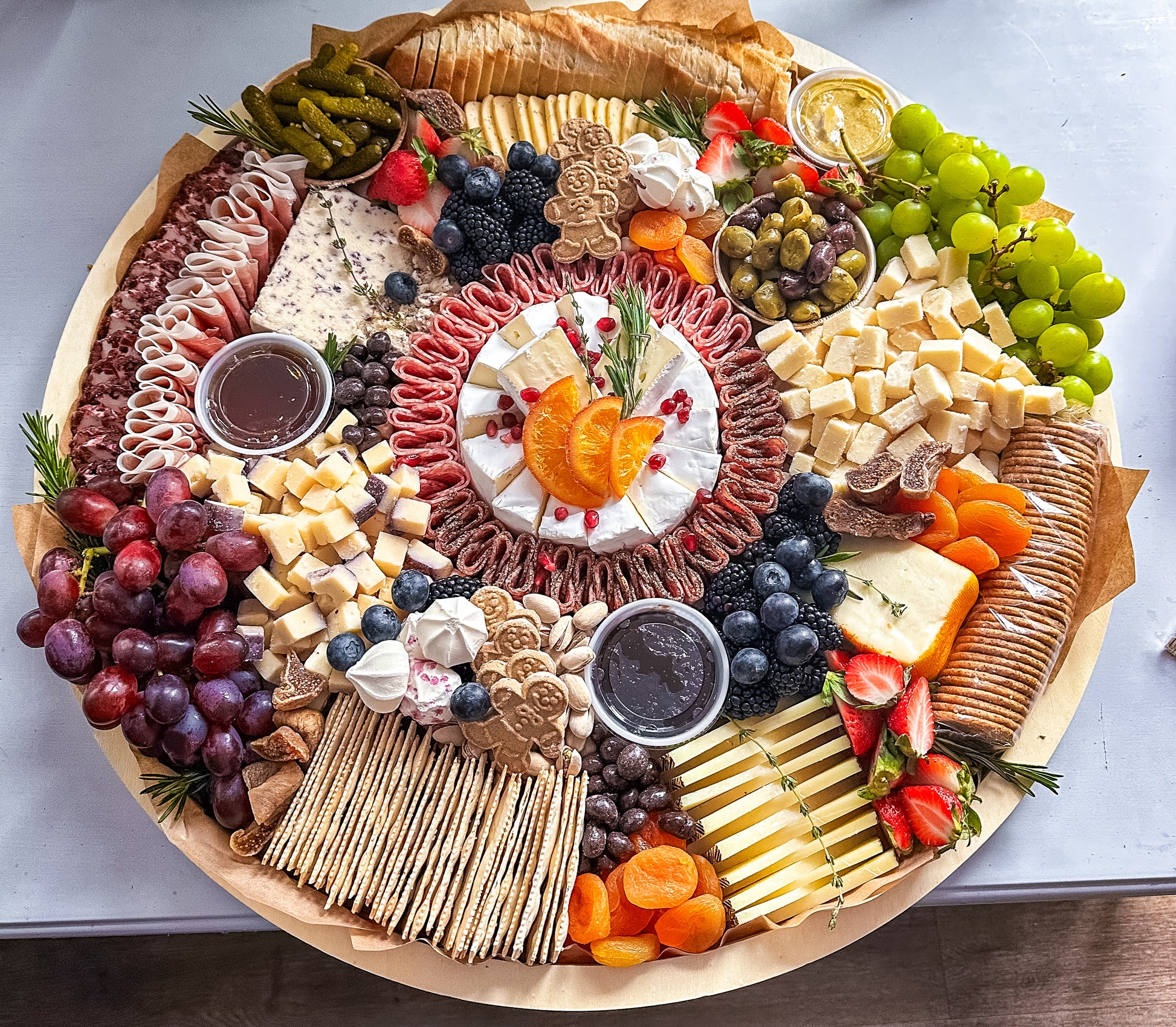 Looking for the perfect spread to bring to a holiday party? Well, we got you covered...our 23-24" Holiday Wood Board will be the highlight of any party this holiday season. This wood board features 6x seasonal cheeses, 4x meats, 3x dips/spreads, fresh fruit, a variety of nuts, baguette, artisan crackers, olives, cornichons, & festive cookies.. This board serves 30-40.