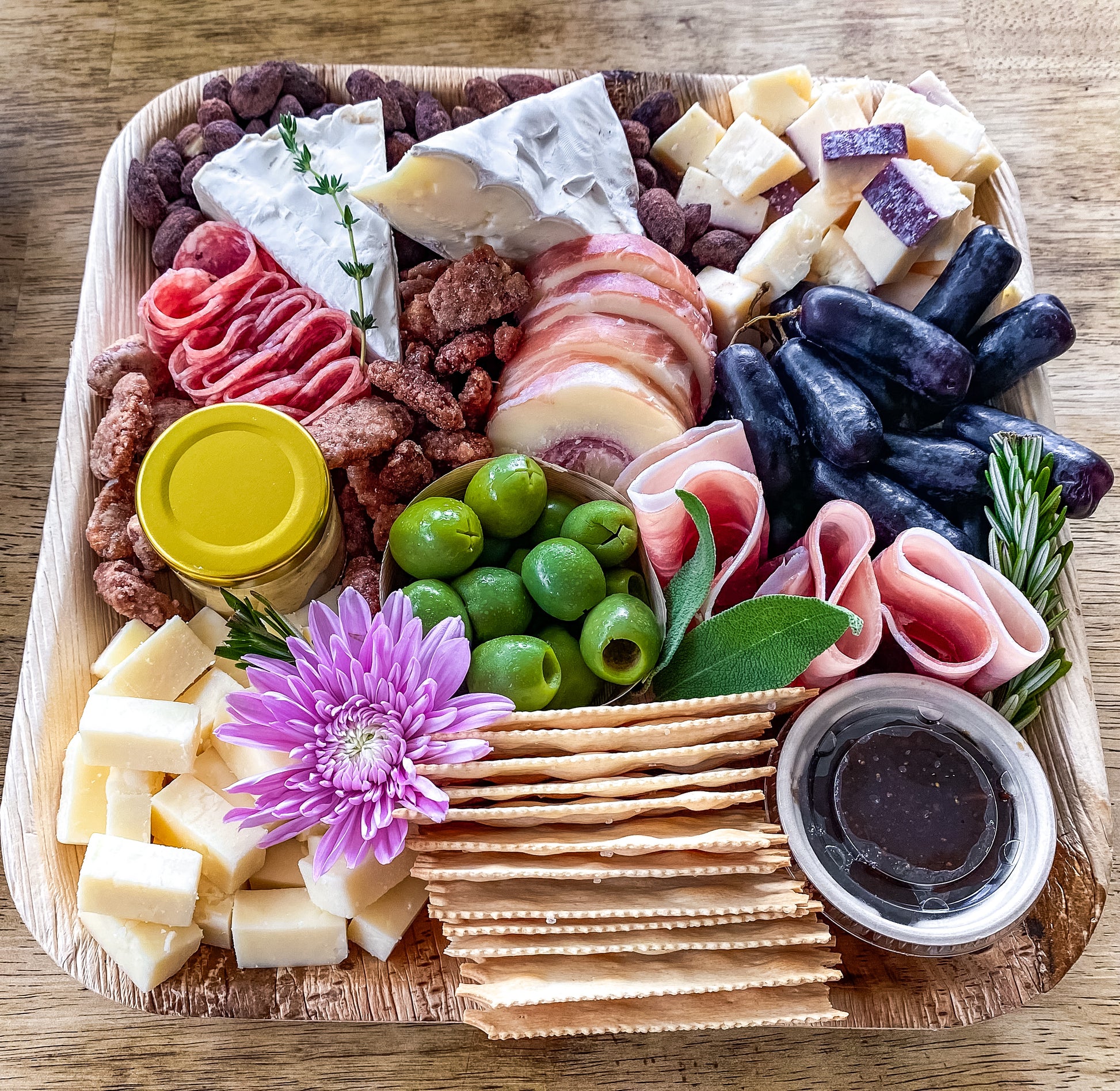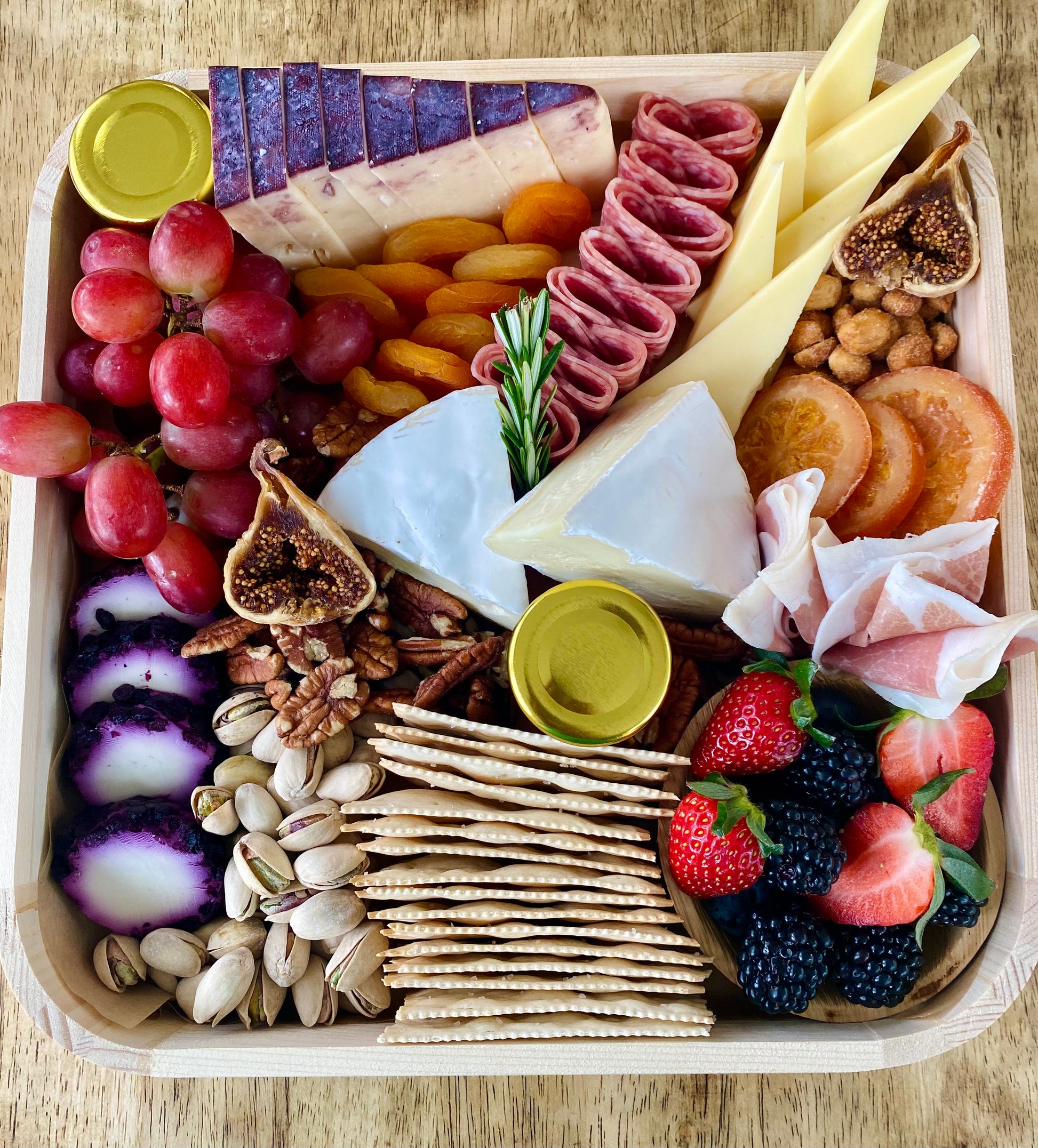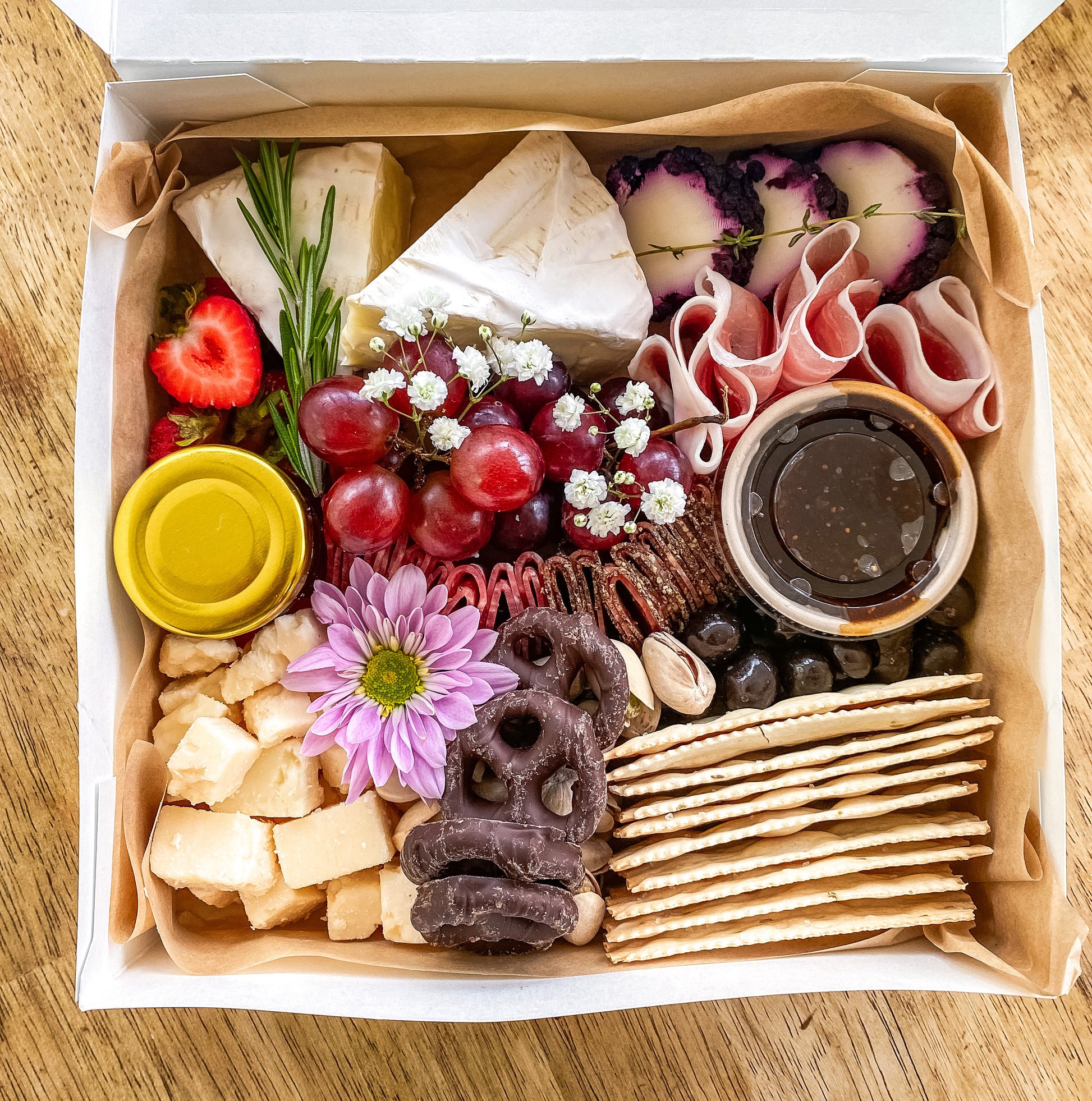 This 8-inch box/board is made for 2 people to indulge & devour all year long! Our Classic for 2 includes 3-4x yummy cheeses, 3x decadent meats, seasonal fruits, dried fruit, pistachios, crackers, fig butter & honey, cornichon pickles, and sweet chocolates!